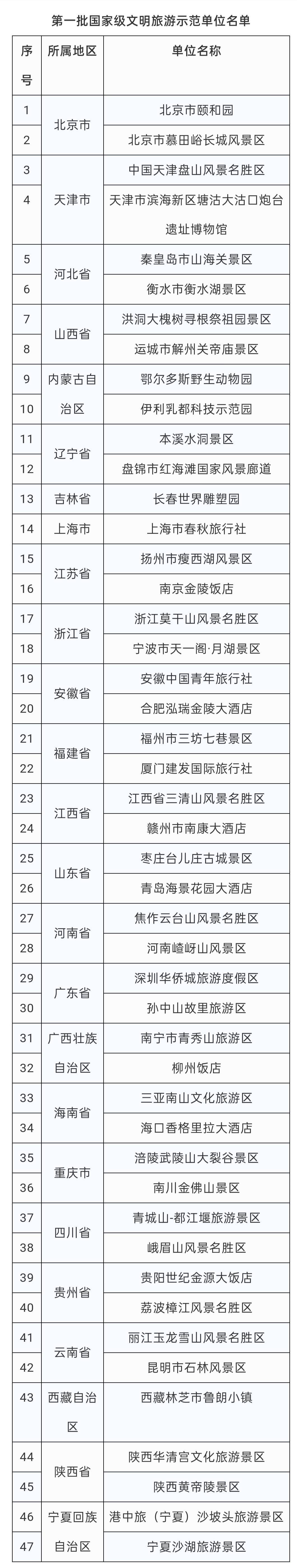47家单位入选第一批国家级文明旅游示范单位