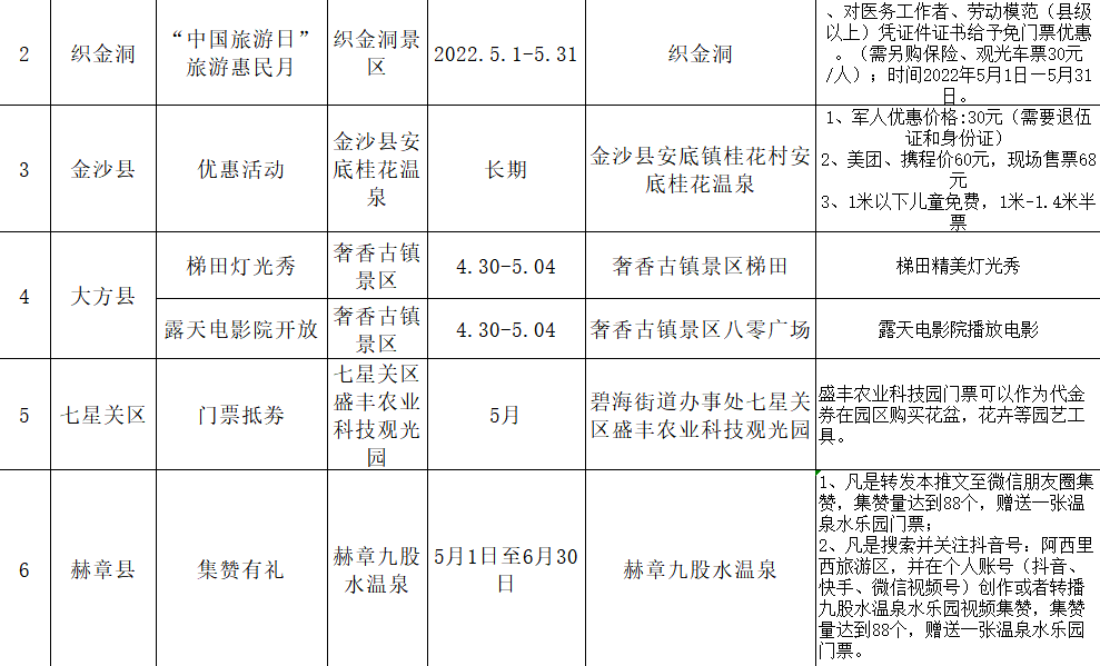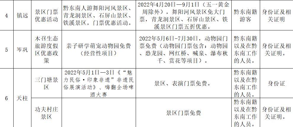 贵阳市南明区贵阳药用植物园景区、贵阳市开阳南江大峡谷景区、贵阳市开阳白马峪旅游景区、贵阳市开阳县猴耳天坑景区、贵阳市乌当万象温泉景区(五一节(2022年4月30日-2022年5月4日)万象温泉实行成人温泉门票挂牌188元/位目前执行优惠99元/位、儿童温泉门票挂牌78元/位目前执行优惠价39元/)、贵阳市花溪青岩古镇景区(4月30日至5月4日期间,警察、医护人员、消防人员凭有效证件免票。4月30日至5月4日期间,线上用户套票9.9元/人。9.9元套票购买渠道:一码游贵州、抖音团购、美团、携程)