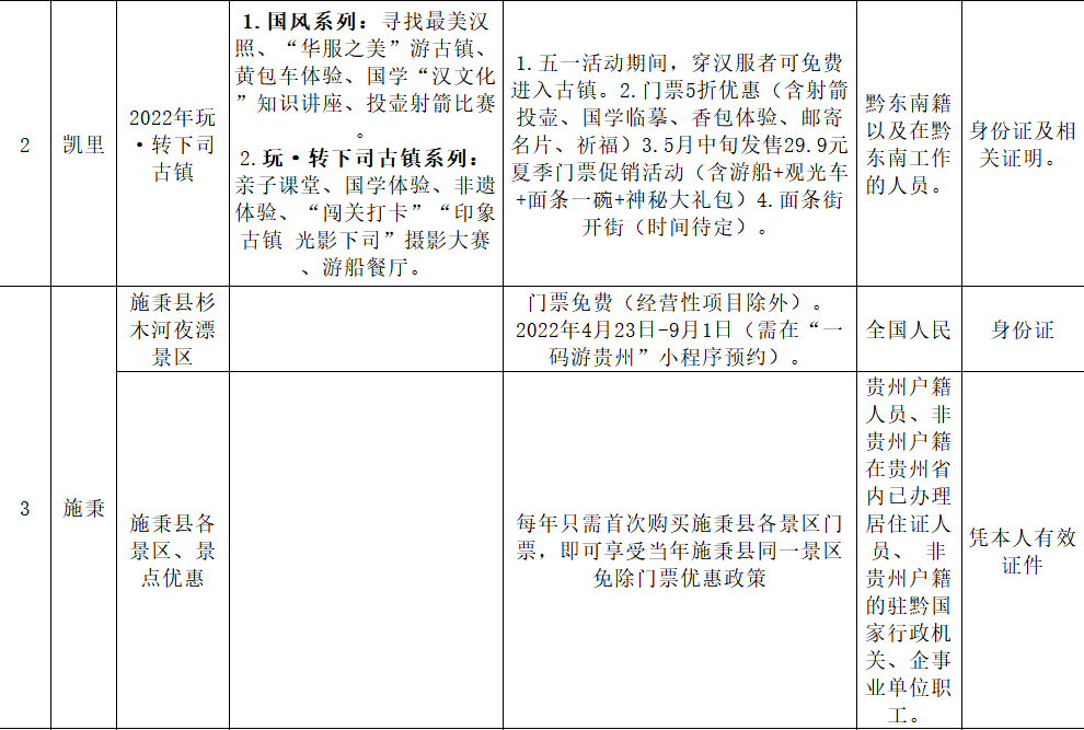 3.优惠内容:安顺市户籍人员凭本人有效身份证件游龙宫景区免门票(不包含景区游船、观光车、观光电梯)。每日限量5千人。