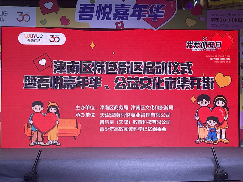 津南区特色街区启动仪式于4月20日在吾悦广场津沽时光里街区举行,由津南区商务局主办,青少年高效阅读科学记忆组委会、吾悦广场、智星汇(天津)教育科技有限公司等合作承办,得到了市、区各级领导的关注与关怀。