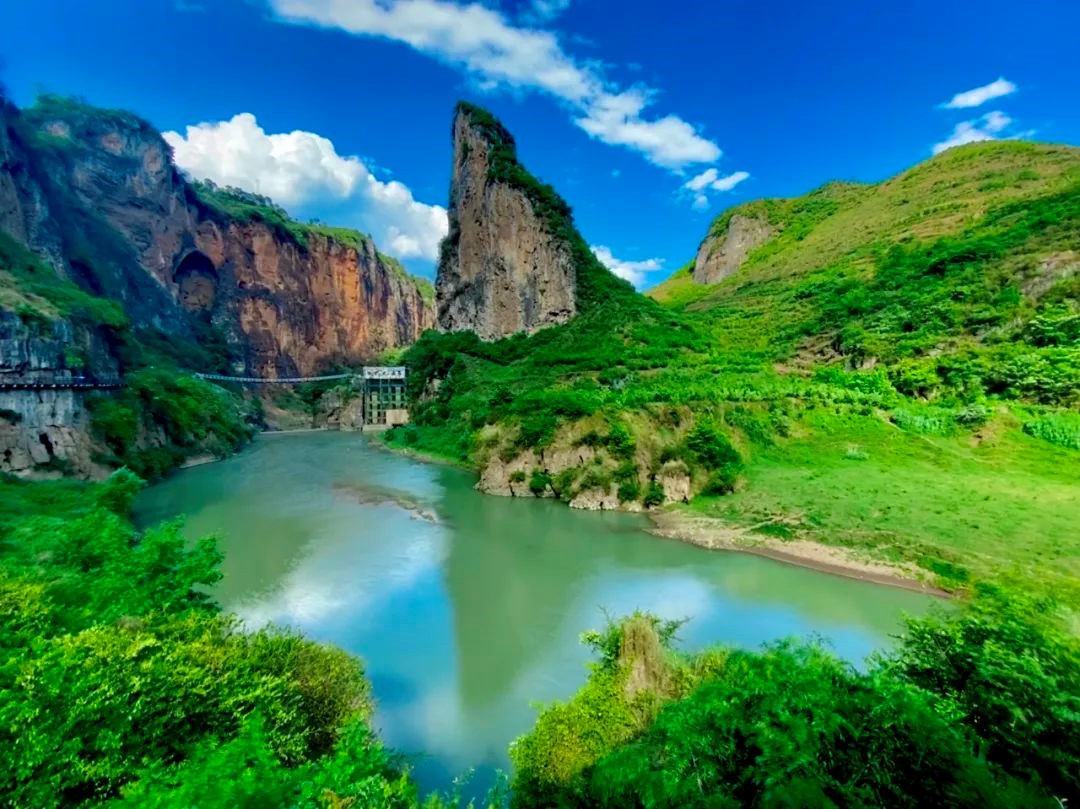 九洞天景区玻璃桥横跨大方县和纳雍县,站在桥上脚下激流涌动,心旷神怡,既可观雷霆天瀑布与电站瀑布双瀑和鸣的壮观奇景,又可观赏到下游河谷的优美风光。