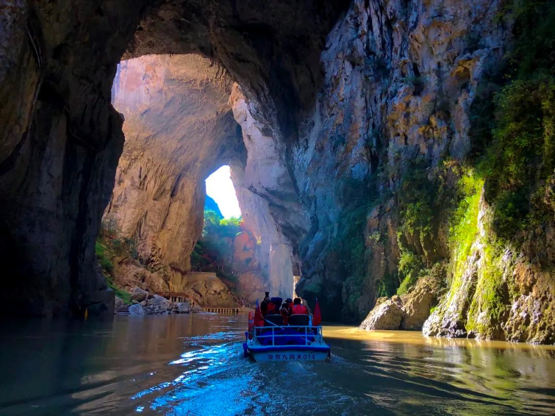九洞天景区游船航线2公里,乘船可参观到9个天窗洞口。坐在船上穿梭于洞天中,除可观赏到幽暗伏流、秀美天窗、精致钟乳石等奇景,还可见一幅洞相接、水相连、天各异,天窗恰如相框呈现天空的壮观美景。