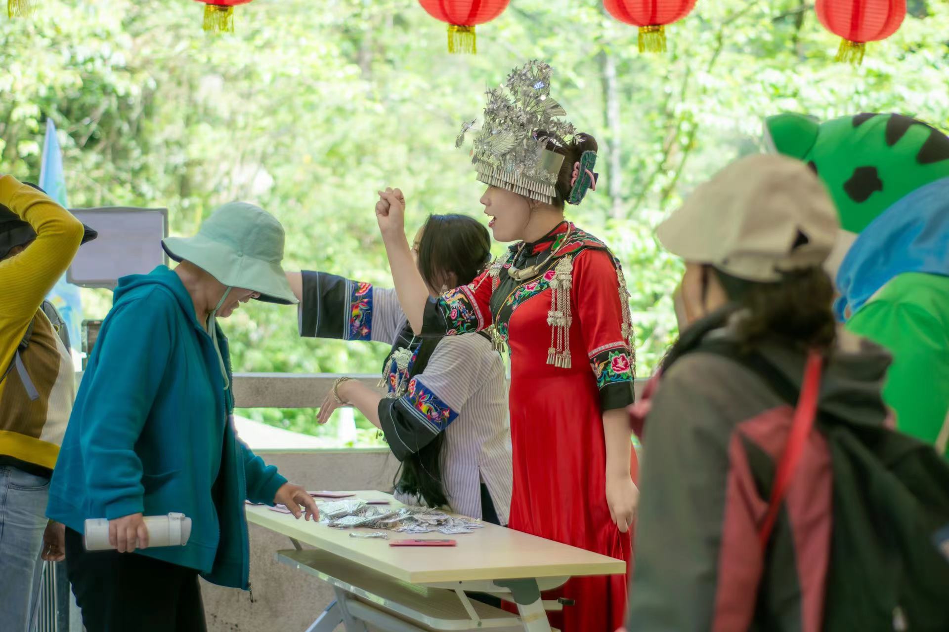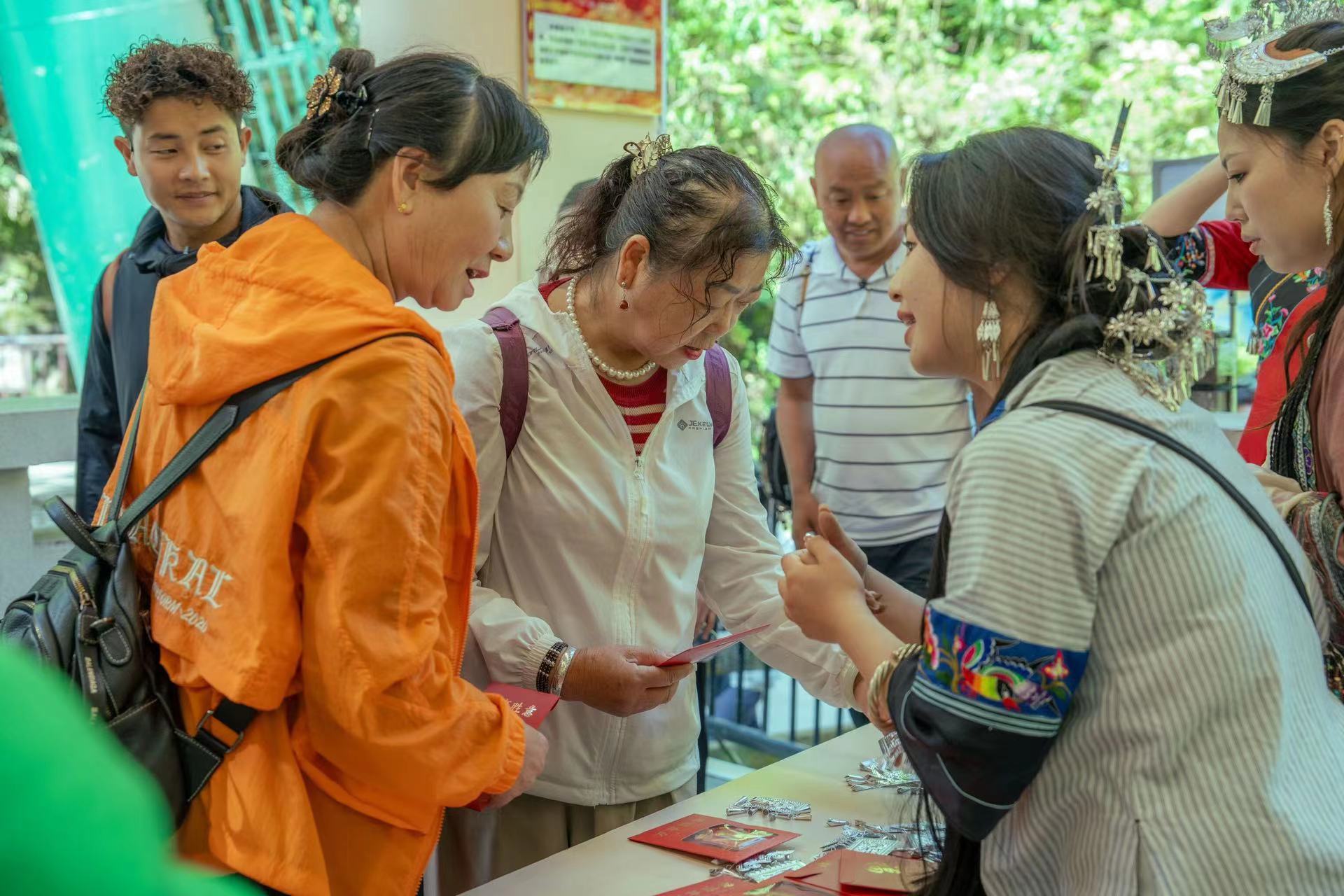 为增强游客的旅游体验,在索道上下站的排队区域,贵州少数民族同胞与游客进行互动,向游客介绍民族服装的特点、文化内涵以及相关的民族故事。游客可跟唱少数民族歌曲,感受民族音乐的魅力;还可参与猜手游戏等。完成互动环节的游客可获得定制福袋、银饰饰品等礼品。
