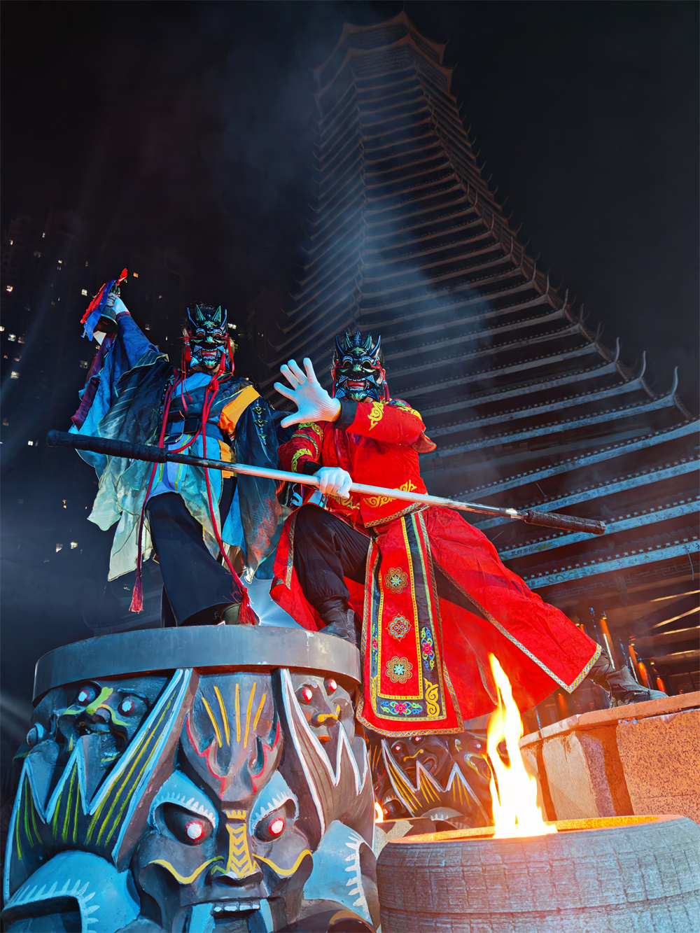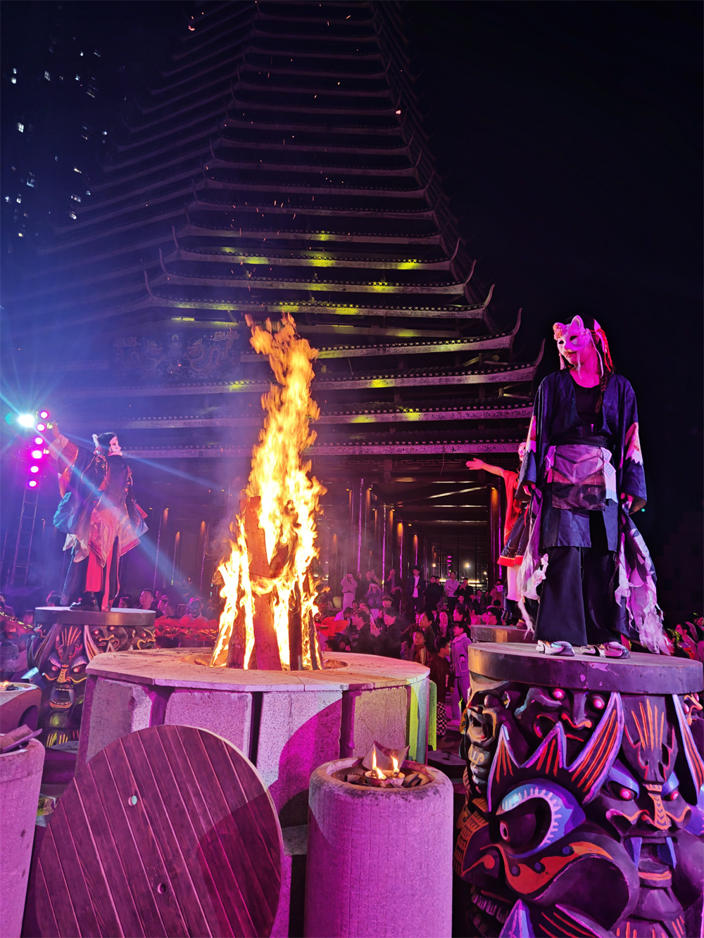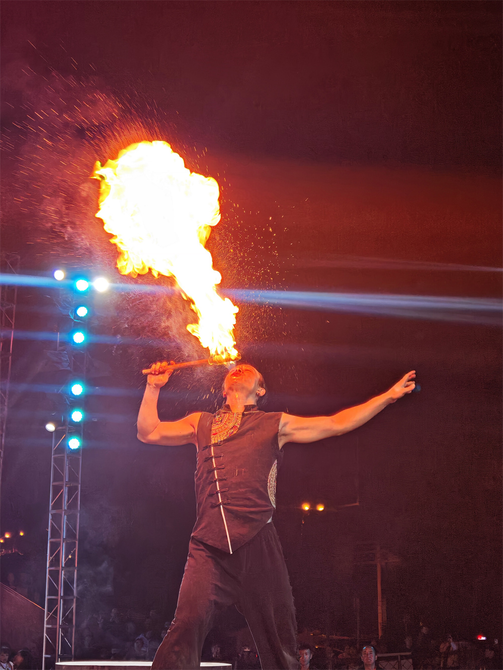 美味的长桌宴后便是精妙绝伦的沉浸式演出,原创剧目《傩·树神祭祀》让树神“降临”观众席,以傩舞开启祈福;《傩·火棍驱邪》以杂技火把再现先民驱邪仪式;《火之傩·驱邪纳福》更以扇骨火把群舞与喷火特技,将傩文化中“以火净秽、以傩赐福”的精神内核演绎得淋漓尽致;独唱《鼓楼飞歌》高亢嘹亮;杂技《鸿运高升》与高空双人威亚《傩·天穹双舞》更让观众惊呼连连。